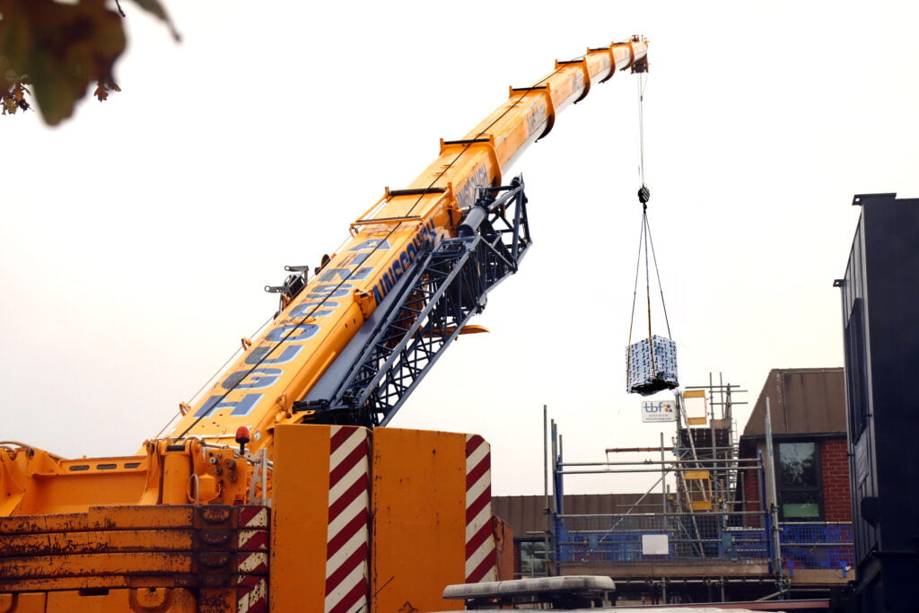 The AHU and steel frame required the use of a 300T mobile crane. The location of this and the bearing capacity of the ground had to be very carefully assessed. Wind speeds were monitored and downtime was encountered. The time was made up without detriment to the completion of this element.